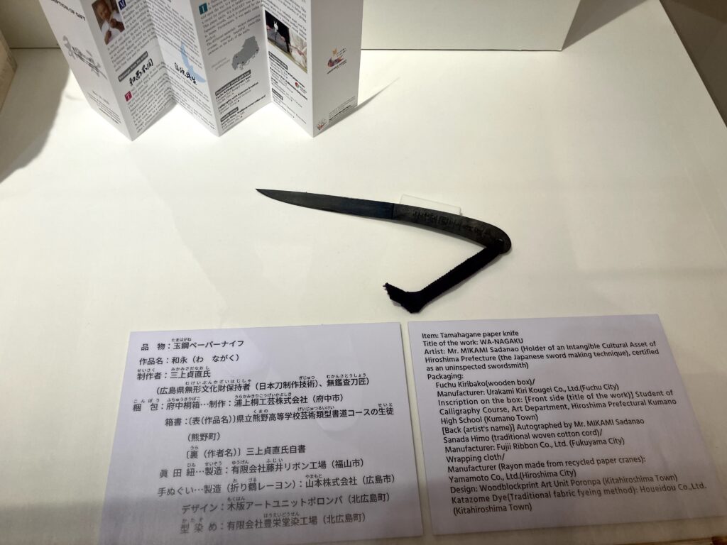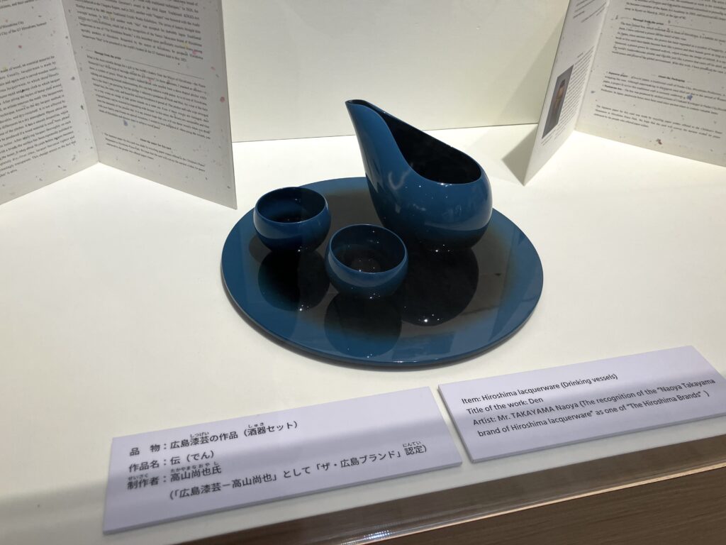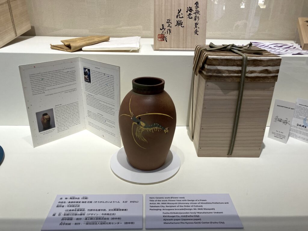 そこで目を引いたのが、各国首脳への贈呈品でした。広島の歴史や文化、伝統を感じられてかつSDGsに配慮したものだそうです。(以下の説明は、作品の上に掲示されていたパネルから引用しています。)